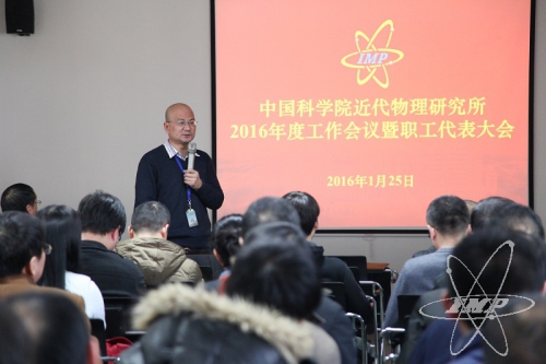近代物理研究所召开2016年度工作会议暨职工代表大会。研究所相关负责人、职工代表、科研骨干、职能部门人员以及离退休职工代表等300余人参加会议。近代物理所党委书记赵红卫、副所长袁平分别主持会议。