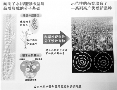 “对水稻来说,高产往往带来品质差、抗病虫害能力低的问题,但有些性状好的水稻却常常不会太高产。‘籼稻的产量,粳稻的品质’,即培育出分蘖数适宜、茎秆强壮、穗大粒多的高产理想株型品种,同时又具有优良的食用品质,这就是我们团队梦寐以求的‘理想型’水稻。”李家洋说。