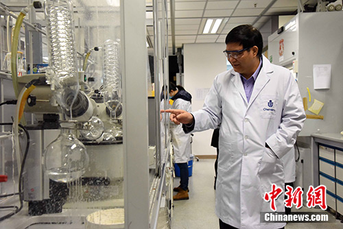 院士、香港科技大学化学系讲座教授唐本忠(左)领衔的研究团队原创、开拓性地提出“聚集诱导发光(AIE)”现象。中新社记者 李志华 摄