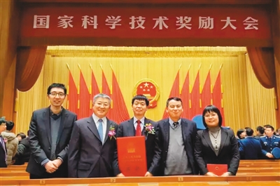 中科院遗传与发育生物学研究所李家洋(中)在科技奖励大会现场 新华社发