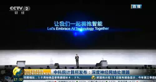▲中科院计算所孙凝晖所长在世界互联网大会上发布寒武纪成果