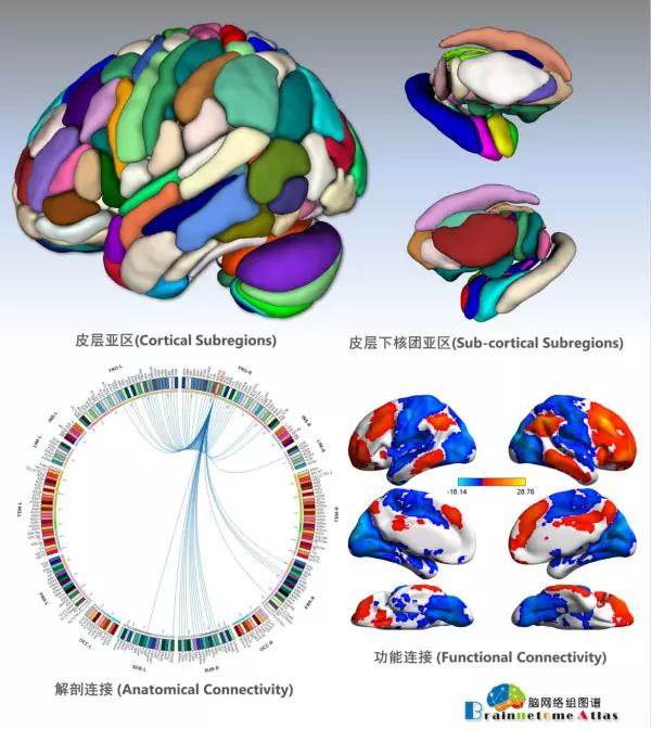 ▲人类脑网络组图谱:包括246个精细脑区亚区,以及脑区亚区间的多模态连接模式