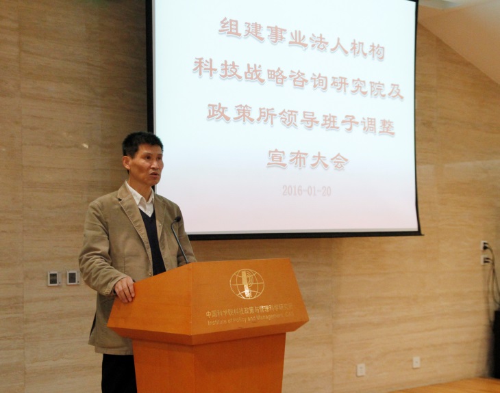 科技战略咨询研究院(正在报批中,简称“战略咨询院”)及科技政策与管理科学研究所(简称“政策与管理所”)领导班子调整宣布大会在政策与管理所举行。中科院副院长李静海、詹文龙,副秘书长曹效业等出席会议。