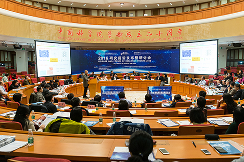 会上,战略咨询院战略情报研究所负责人冷伏海做了《2016研究前沿》发布报告。战略咨询院院长潘教峰做了《2016研究——中国表现》报告,详细介绍中国表现卓越的30个研究前沿。