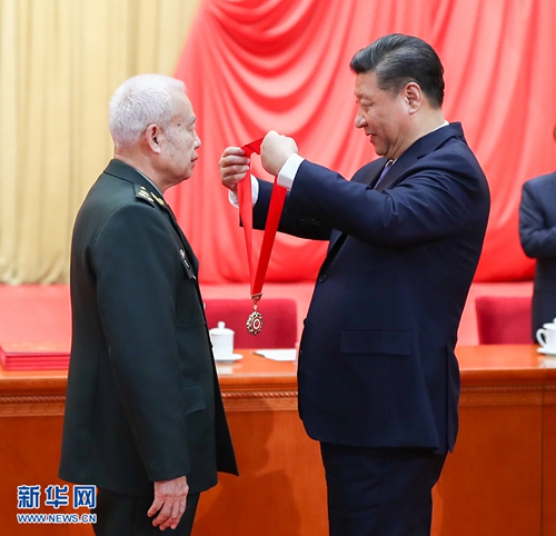 1月8日,2018年度国家科学技术奖励大会在北京人民大会堂隆重举行。这是中共中央总书记、国家主席、中央军委主席习近平向获得2018年度国家最高科学技术奖的中国人民解放军陆军工程大学钱七虎院士颁发奖章。 新华社记者 谢环驰 摄