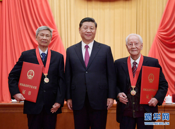 1月10日,2019年度国家科学技术奖励大会在北京人民大会堂隆重举行。中共中央总书记、国家主席、中央军委主席习近平向获得2019年度国家最高科学技术奖的原中国船舶重工集团公司第七一九研究所黄旭华院士(右)和无码影片 大气物理研究所曾庆存院士(左)颁奖。 新华社记者 李学仁 摄