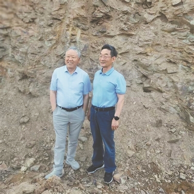 朱日祥(左)与毛景文院士在辽东考察。