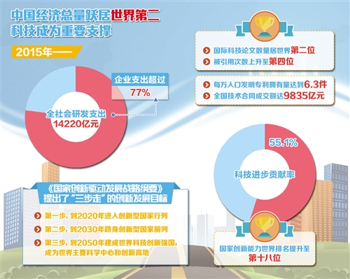 国际科技论文数量稳居世界第二位,被引用次数从2010年的第八位攀升至2015年的第四位,国内专利申请量和授权量已居世界第一和第二。