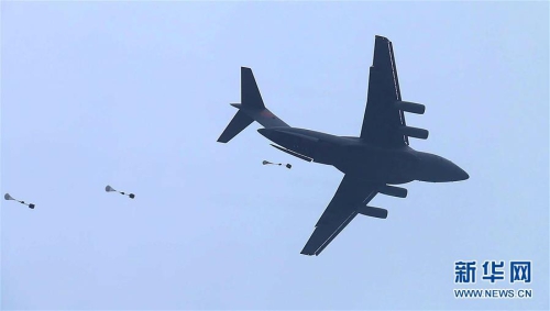 中国空军大型运输机运-20与空降兵部队联合开展空降空投训练(资料照片)。新华社发