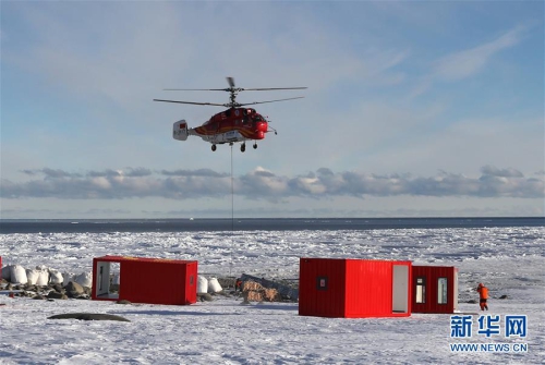 船载“雪鹰12”Ka-32直升机将物资吊运至恩克斯堡岛新建站区(2017年12月9日摄)。新华社记者 白国龙 摄
