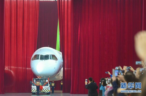我国自主研制的C919大型客机首架机,在中国商飞公司总装制造中心浦东基地厂房内正式下线(2015年11月2日摄)。新华社发(裴鑫 摄)