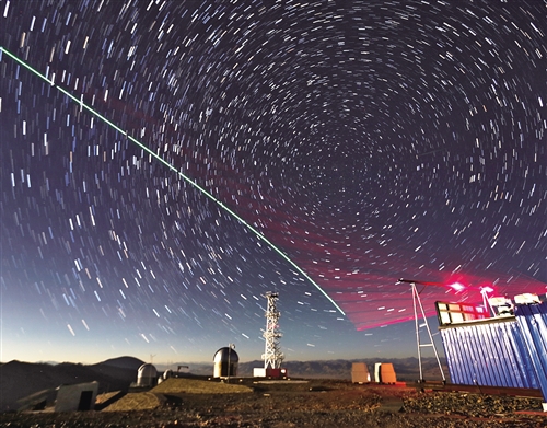 图为“墨子号”量子科学实验卫星与阿里量子隐形传态实验平台建立天地链路(合成照片)。