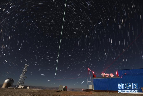 在西藏阿里观测站,“墨子号”量子科学实验卫星过境,科研人员在做实验(2016年12月10日摄,合成照片)。新华社记者 金立旺 摄