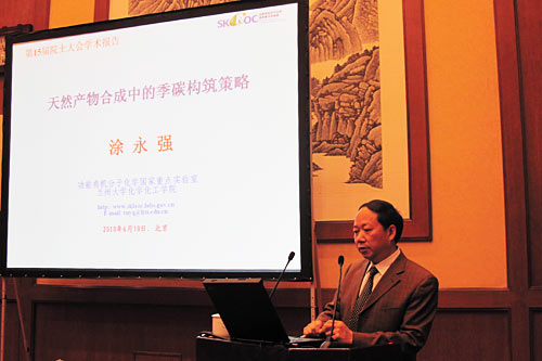 涂永强院士作了“天然产物合成中季碳构筑的策略”的专题报告。报告中说,众多的活性天然有机化合物都含有关键的季碳结构单元,如治疗老年痴呆症的石蒜科生物碱Galanthamine,治疗呼吸系统疾病的百部生物碱Maistemonine,治疗白血病的三尖杉生物碱Cephalotaxine等。季碳结构,特别是含有多官能团(如多取代基、多环或多中心)的复杂季碳结构,其高效、高立体选择性的构筑一直是有机合成中具有挑战性的研究内容之一。涂永强院士在报告中介绍了在此方面的研究进展。