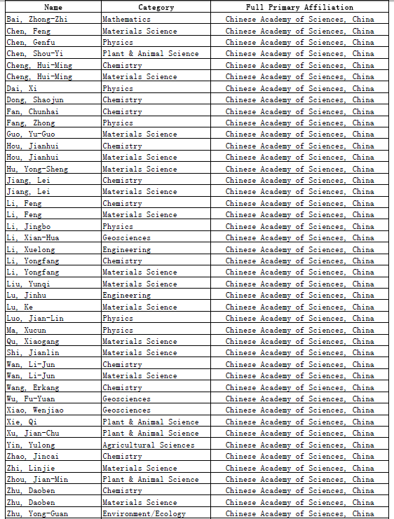 科睿唯安高级引文分析师David Pendlebury说:“在过去的20年中,中国科研人员的发文量以及在Web of Science所收录学术期刊中所展现出的世界影响力显著提升,名单中可以看到中国高被引论文和作者的增长,特别是在物理学领域。今年249位(以人次计算)来自中国的科研精英入选,使得中国在美国和英国之后位居本次榜单的第三位。在材料科学领域,中国的论文产出是美国的两倍,而且在该领域中,中国高被引论文的表现呈现出明显优势。在其他的学科领域,中国不仅仅是赶超,而是展现出了领先的动力。”