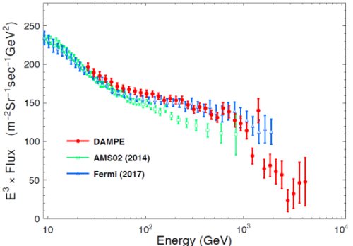 “悟空”工作530天得到的高精度宇宙射线电子能谱(红色数据点),以及和美国费米卫星测量结果(蓝点)、丁肇中院士领导的阿尔法磁谱仪的测量结果(绿点)的比较。