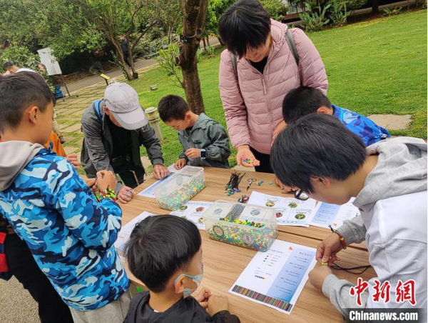 在当日的活动中,小学生们还戴着护具、手提篮子,体验了在野外采集稀有、濒危种子的工作;并在植物种子展示区,了解榼藤、枫香树、橡胶等37种奇特植物种子或果实,制作属于自己的植物条形码手串。