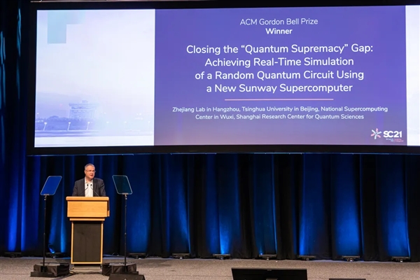 11月18日下午于美国密苏里州圣路易斯举行的全球超级计算大会(SC21)上,国际计算机协会(ACM)将2021年度“戈登贝尔奖”授予中国超算应用团队。这支由之江实验室、国家超算无锡中心等单位研究人员组成的联合科研团队,基于新一代神威超级计算机的应用“超大规模量子随机电路实时模拟”(SWQSIM)获此殊荣。