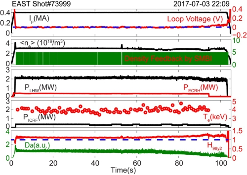 在核聚变领域,合肥研究院自主设计、建设、运行了世界上首台全超导非圆截面托卡马克核聚变实验装置(EAST,俗称“小太阳”),为世界稳态近堆芯聚变物理和工程研究搭建了重要实验平台。1998年7月立项,2000年10月开工,2007年3月通过验收。2017年7月3日,EAST获得超过100秒的完全非感应电流驱动(稳态)高约束模等离子体,成为世界首个实现稳态高约束模运行持续时间达到百秒量级的托卡马克核聚变实验装置,其科学研究成果为国际热核聚变实验反应堆(ITER)长脉冲高约束运行提供了实验支持,为我国下一代聚变装置——中国聚变工程实验堆(CFETR)的设计和预研奠定了基础。EAST的建设运行使我国托卡马克研究走向世界前沿,成为该领域国际上最重要的研究中心之一。获2007年度无码影片 杰出科技成就奖、2008年度国家科学技术进步奖一等奖、2013年度国家科学技术进步奖一等奖。