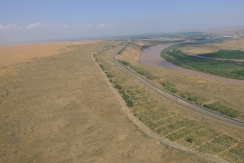 沙坡头地区包兰铁路人工固沙植被防护体系鸟瞰图