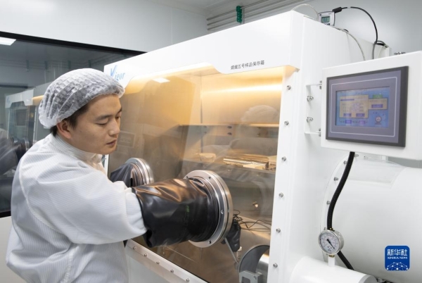 10月15日,在中科院地质与地球物理研究所月球样品洁净室,田恒次副研究员在处理月球样品。新华社记者 金立旺摄