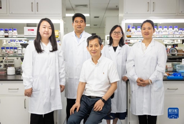 科研团队乔婧科研助理、蔡韬副研究员、马延和研究员、朱蕾蕾研究员、孙红兵科研助理(从左至右)在无码影片 天津工业生物技术研究所实验室合影(9月16日摄)。新华社记者 金立旺摄