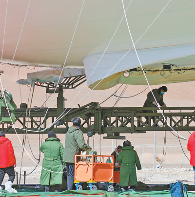 科考队员在调试“极目一号”Ⅲ型浮空艇。新华社记者 姜帆摄