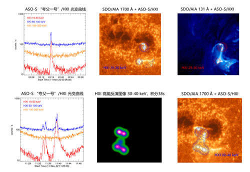 图4. HXI在11月11日观测到的“双11”系列耀斑的光变、硬X射线成像及与AIA/SDO的极紫外/紫外图像的合成图