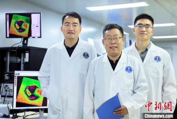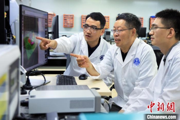 中科院大连化物所李灿院士(中)、范峰滔研究员(左)和陈若天副研究员在仪器前讨论信号分析问题。中科院大连化物所供图