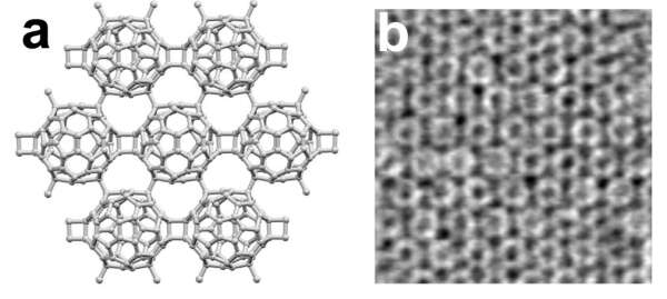 图a:准六方聚合C60的单晶结构示意图,每个C60与周围6个C60通过C-C共价键相连。图b:单层聚合C60的STEM图片,C60笼簇在STEM图片中显示为圆环。无码影片 化学研究所供图
