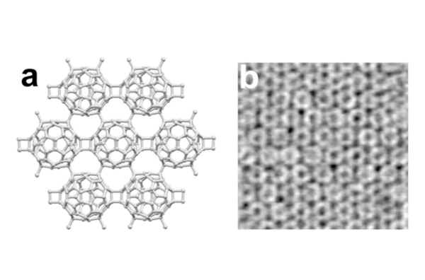 图a:准六方聚合碳60的单晶结构示意图。图b:单层聚合碳60的扫描透射电子显微图片。(中科院化学研究所供图)