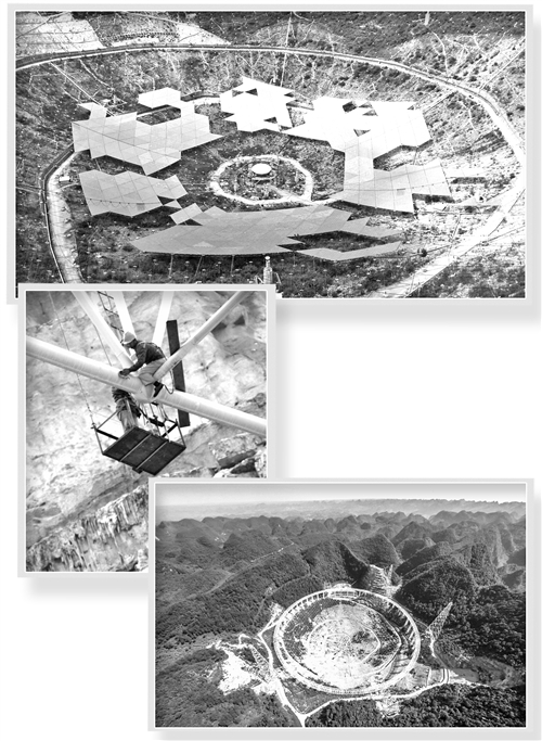 FAST建设施工现场,工人在高空作业。(资料图片)