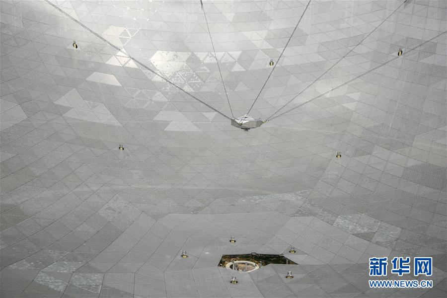 6月29日,500米口径球面射电望远镜(FAST)工程核心部件馈源舱在进行调试,其下方缺口处即目前尚未安装的7块反射面板。新华社记者 刘续 摄