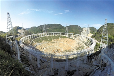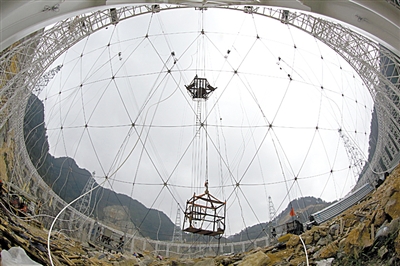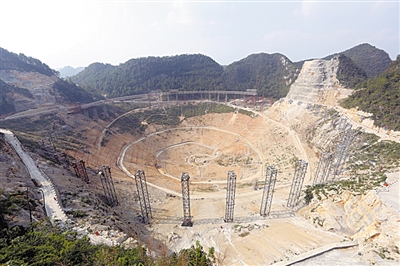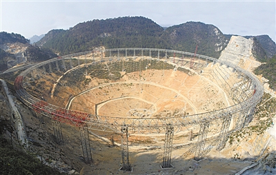 目前,FAST的圈梁工程已顺利完成,支撑铝合金反射面的索网工程也已合龙。工程将进入反射面的安装阶段。预计FAST工程将在两年后完工。(图片由FAST工程团队提供)