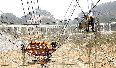 2015年2月4日,FAST索网安装工程合龙,图为工人正在安装最后一根钢索。
