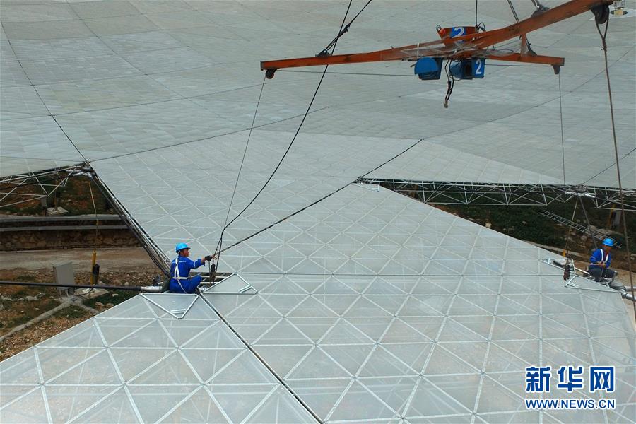 4月10日,工作人员在安装500米口径球面射电望远镜(FAST)工程反射面面板。新华社记者 欧东衢 摄