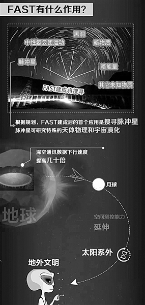 国家天文台副研究员郑永春博士在介绍FAST的用途时说,FAST主要用于研究脉冲星、中性氢、黑洞吞噬小天体、星体演化、外星文明搜寻等。