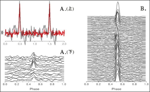 图为新脉冲星的归一化平均脉冲轮廓和单脉冲。A(上)为FP1平均脉冲轮廓,FAST通过约52.4秒漂移扫描(红色)产生信噪比为Parkes望远镜L波段积分2100秒结果(灰色)信噪比的3倍,表现出FAST高灵敏度优势。A(下)为FP1单脉冲轮廓。B为FAST采用跟踪观测5分钟,获得的另一颗新脉冲星FP2的单脉冲轮廓。
