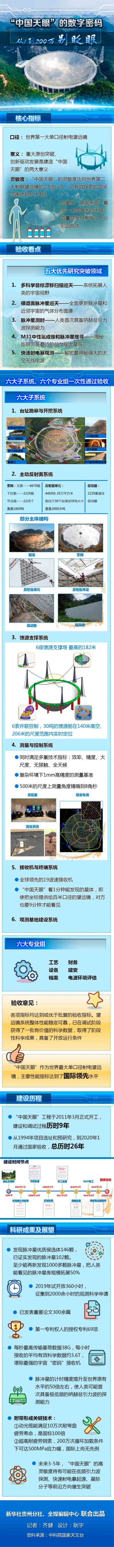 验收会上,中科院院士武向平等6位专家分别宣读工艺验收、电波环境保护等验收意见,国家发改委高技术司副司长沈竹林宣布“中国天眼”各项指标均达到或优于批复的验收指标,主要性能指标达到国际领先水平,具备了开放运行条件。