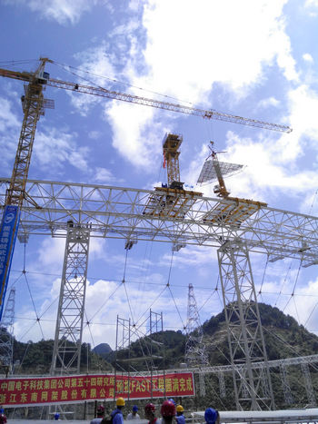 2015年8月2日下午两点半,正在贵州喀斯特洼地建造的世界最大单口径射电望远镜——500米口径球面射电天文望远镜(FAST)第一块反射面单元在工程现场成功吊装,标志着该工程建设进入最后冲刺阶段。