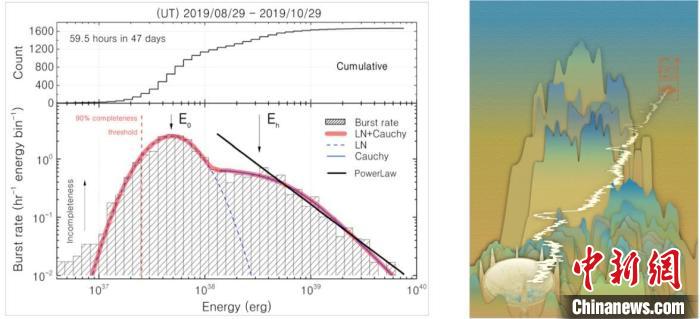 快速射电暴FRB 121102平均每小时爆发率能量分布(左)。FAST观测快速射电暴艺术想象图(右) 国家天文台供图