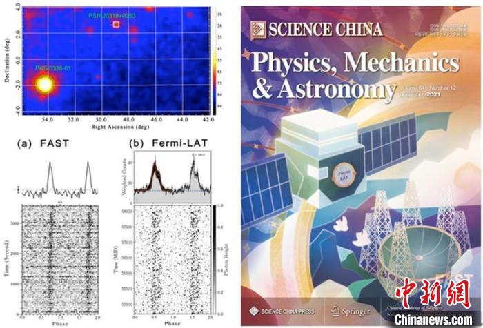 PSR J0318+0253位置和积分脉冲轮廓(左);FAST-FermiLAT合作开展脉冲星观测。国家天文台供图
