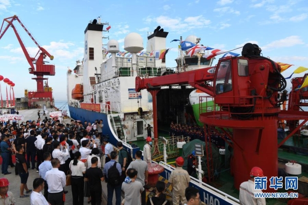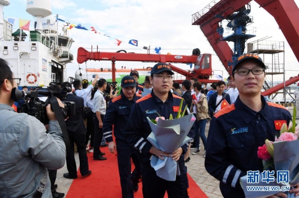 11月28日,在三亚市南山港,“探索一号”科考船的科考人员下船接受欢迎人群的迎接。新华社记者 赵颖全 摄