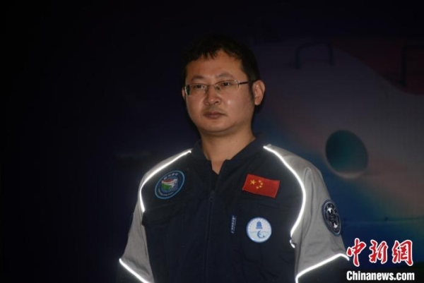 廖佳伟身着潜航员制服科普展现场讲解。孙自法摄