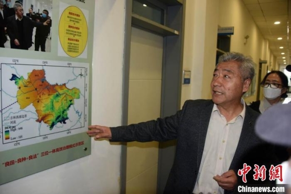 中科院东北地理所研究员、大安碱地生态实验站站长梁正伟介绍东北黑土盐碱地科技治理情况。中新社记者 孙自法 摄