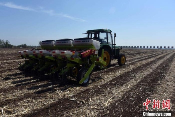 “梨树模式”研制的免耕播种机在中科院“黑土粮仓”科技会战梨树万亩示范区作业。中新社记者 孙自法 摄