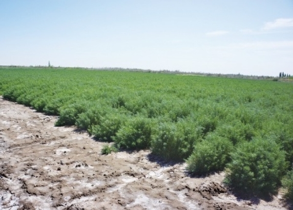 在新疆克拉玛依小拐乡新垦盐碱荒地上进行的生物改良试验,通过第一、二年种植盐地碱蓬吸盐,第三年种植细齿草木樨培肥,第四年种植棉花的种植模式,依靠耐盐碱植物的生长发育吸收土壤中的盐碱成分,实现土壤脱盐,从而使盐碱地变成可种植经济作物的优质地。