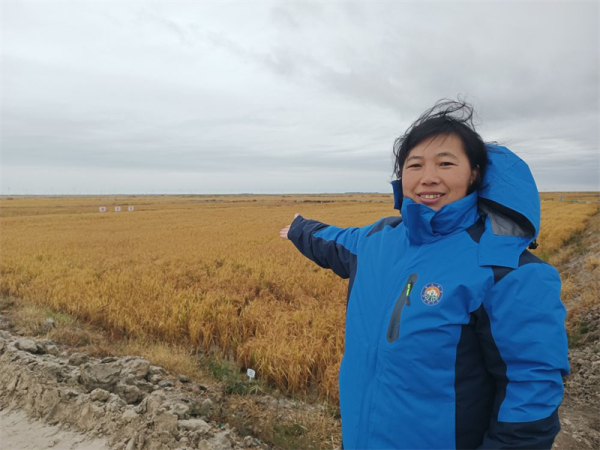 中科院东北地理所高级工程师刘淼在大安市海坨乡互助村盐碱地土壤改良试验示范基地展示改良后的稻田。新华社记者 李双溪 摄
