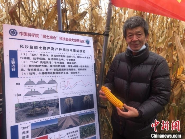 在吉林西部,中科院农业专家展示采用新垄型耕作种出的玉米。郭佳 摄