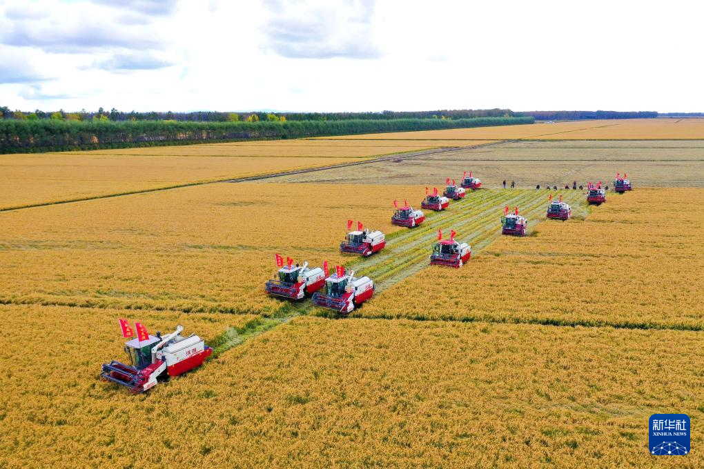 这是9月27日在位于双鸭山市友谊县的北大荒农业股份有限公司友谊分公司拍摄的秋收现场(无人机照片)。新华社记者 石枫 摄